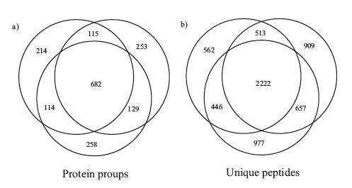 | Fig. 4.Overlap of identified protein groups (a) and peptides (b) in three consecutive analyses. | |