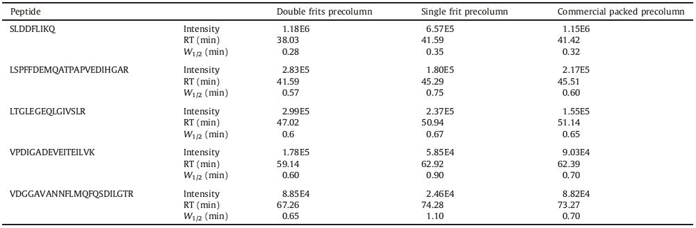 Table 1 Comparison of peak intensity, retention time (RT), and peak width at 1/2 height (W1/2) for five peptides in E. coli digests obtained with different precolumns. |