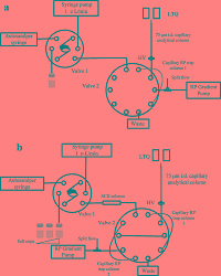 | Fig. 2.Schematic diagram of HPLC–ESI–MS/MS system, (a) 1D LC–MS/MS system, (b) 2D HPLC–MS/MS system. | |
