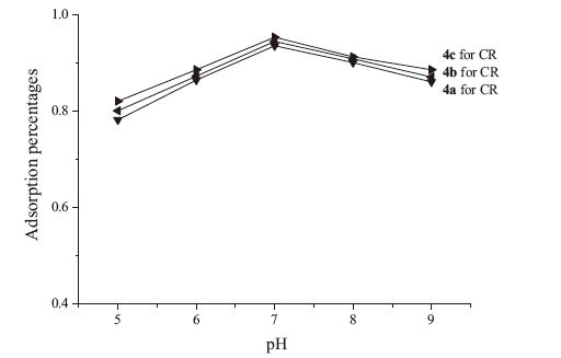 Congo Red was chosen as a representative to study the saturated adsorption capacity of polymers 4a-4c. The results are shown in Fig. 3. The saturation adsorption capacity was as high as 1.3-1.4 mmol/g, which was outstanding comparing with the other absorbents for dyes [22,23]. On the other hand, the similar saturated adsorption capability of polymers 4a-4c with different bridging polyethylene glycol chains also supported the above proposed adsorption mechanism. Fig. 4 shows the adsorption percentages of polymers 4a-4c for CR under different pH values of 5-9. The adsorption percentages changed in the range of 78%-96%, which were fairly stable comparing with the other absorbents [22,23], indicating the good applicability in a wide pH range. The reused property of polymer 4c for CR was also investigated at pH 7. After adsorption for CR, the polymer 4c was desorbed by 10% HCl and 10% NaOH, subsequently washed adequately by distilled water and dried by vacuum. Then the polymer was reused for dye desorbed. The adsorption percentages in five cycles were 95.4%, 87.6%, 82.7%, 80.6%, 78.3%, respectively. The gradual decrease of adsorption percentages might be attributed to the strong binding action in some complexation cavities, which was difficult to be desorbed in acid or base. The adsorption percentage was as high as 78.3% after five cycles, suggesting their good reused property.