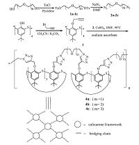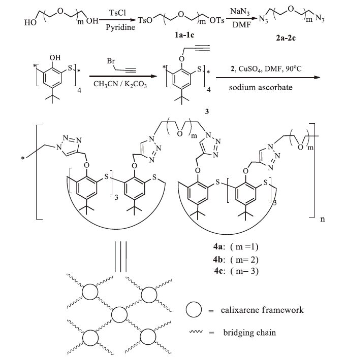 Synthesis of thiacalix[4]arene 1, 2, 3-triazole-polyethylene glycol netty polymers 4a-4c: Under nitrogen atmosphere, a mixture of compound 3 (0.32 g, 0.4 mmol), compound 2a (0.14 g, 0.9 mmol), CuSO4 (0.40 g, 1.6 mmol), and sodium ascorbate (0.79 g, 4 mmol) were stirred in dry DMF (10 mL). The mixture was heated at 90 ℃ for 15 h until compound 3 completely vanished by TLC analysis. After cooling, the reaction system was diluted with CHCl3 (30 mL) and washed with water (3 × 20 mL). The organic phase was separated and dried over MgSO4. After evaporating off the solvent to dryness, the powder was washed subsequently by 10 mL of acetone and 10 mL of methanol to remove unreacted and small intramolecular-bridging materials. The residue was then dried in vacuum. 0.38 g of polymer 4a was obtained as light yellow powders. Using the same procedure substituting 2a with compound 2b or 2c, polymer 4b (0.41 g), and 4c (0.43 g) were obtained as light yellow powders, respectively. Polymer 4a: 1H NMR (500 MHz, CDCl3): δ 1.13 (bs, 36H, But), 3.86-5.14 (m, 24H, OCH2 and NCH2), 7.01 (bs, 4H, N-CH(55C)), 7.19-7.33 (m, 8H, ArH). Polymer 4b: 1H NMR (500 MHz, CDCl3): δ 1.14 (bs, 36H, But), 3.90-5.17 (m, 32H, OCH2, NCH2), 6.99 (bs, 4H, N-CH(55C)), 7.17-7.36 (m, 8H, ArH). Polymer 4c: 1H NMR (500 MHz, CDCl3): δ 1.15 (bs, 36H, But), 3.89-5.20 (m, 40H, OCH2, NCH2), 7.03 (bs, 4H, N-CH(55C)), 7.15-7.35 (m, 8H, ArH). The elemental analysis, IR spectrum, SEM, and Osmometric Mn of polymers 4a-4c are shown in Table 1, Figs. 1 and 2, respectively.