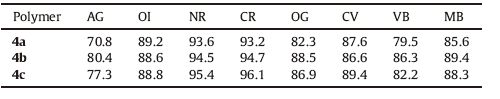 Table 2 dyes adsorption percentages of polymers 4a-4c. |