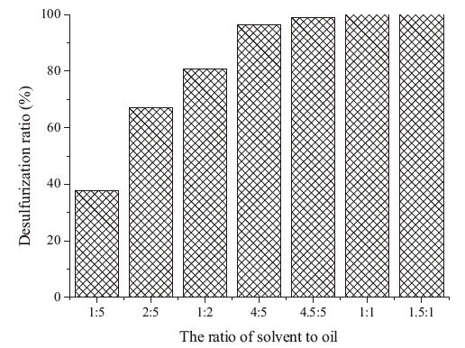 As is shown in Fig. 2, the sulfur removal ratio increased with VIL/Voil increasing. The extractive desulfurization ratio rose from 37.2% to 96.3% quickly with the VIL/Voil increasing from 1:5 to 4:5. While the VIL/Voil was increasing further, the desulfurization ratio was basically flat. The reason was that the amount of IL was insufficient to complex with DBT of the model oil under the condition of VIL/Voil≤4:5; but with the increase of VIL/Voil, the IL had more opportunities to contact with DBT, thus the sulfur removal ratio increased. Moreover, the sulfur removal ratio of DBT increased slowly to 98.9% and 100%, when the VIL/Voil increased further from 4.5:5 to 1:1. The results indicate that VIL/Voil of 1:1 is optimal, and the utilization of excessive IL is not economical.
