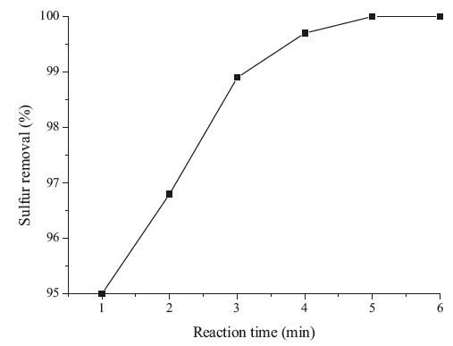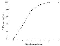 | Fig. 3.Effect of extractive time on the sulfur removal of DBT. Conditions: T = 300 K; VIL/Voil = 1:1. | |