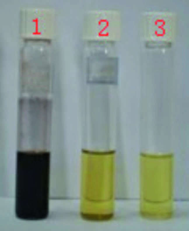 In view of the general suitability for different sulfur-containing compounds, extractive performance of [BMIM]HSO4/FeCl3 in the desulfurization of actual diesel was tested further. As shown in Fig. 4, the initial sulfur content of diesel oil was 12,400 ppm, and the sulfur content dropped to 120 ppm after extraction, indicating that most of the sulfide in actual diesel oil was removed and the extent of sulfur removal could reach 99% after a single extraction. Fig. 5 shows three samples of diesel oil. No. 1 is actual diesel oil with a high sulfur content; No. 2 is diesel sample No. 1 after extractive desulfurization with [BMIM]HSO4/FeCl3 and No. 3 is 0# diesel fuel commercially available from a gas station. From Fig. 5, we can see that the color of diesel sample No. 2 obviously became lighter after processing compared with the diesel No. 1; while diesel No. 2 was very similar or even the same with diesel No. 3 based on appearance and sulfur content.