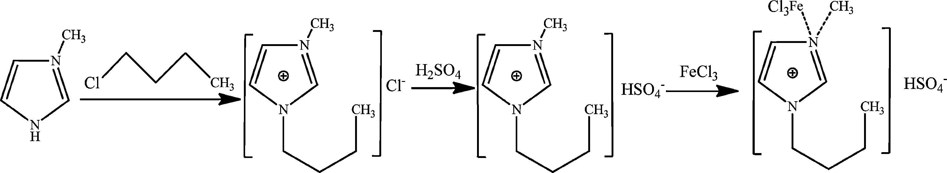 2.3. Preparation of ionic liquids[BMIM]Br/FeCl3, [BMIM]Cl/FeCl3, [BMIM]OH/FeCl3, [BMIM] HSO4/FeCl3, [BMIM]BF4/FeCl3, [BMIM]HSO4/CuCl2, [BMIM]HSO4/ CoCl2, [BMIM]HSO4/ZnCl2, [BMIM]HSO4/MoCl2, [BMIM]HSO4/ MnCl2, [BMIM]HSO4/FeCl3 were prepared by the procedures described in published literature [26, 27, 28]. The first step is to synthesize the intermediate ([BMIM]Cl), which could be converted to the ILs with different anions, and then followed by the addition of an equal-molar quantity of the corresponding metal salt in a round-bottom flask maintained for 5 h at room temperature (300 K). The residual reactant and water were removed by a rotary evaporator. The ILs were dried in vacuum to yield the products as colorless liquids. In the case of [BMIM]HSO4/FeCl3 for example, Scheme 1 shows the synthesis route of [BMIM]HSO4/ FeCl3. The structures of the prepared ILs were identified by FT-IR and ESI-MS.
