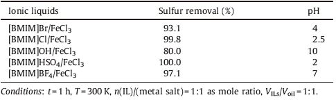 3.2. Effect of anions in ILs on the extractive desulfurization of DBTAs seen in Table 1, the nature of the anion in ILs, indeed, had an influence on the extraction activity for DBT when the molar ratio of the metal salt and imidazolium cation are the same. As is well known, the lone pair of electrons on the S atom results in DBT displaying Lewis base properties, while metal-based ILs are Lewis acids. The extractive desulfurization was actually accomplished by the acid-base complexation reaction. Metal-based ILs are the complexes formed by the anions of ILs and metal salts. The complexing powers of various ILs with FeCl3 are different, which leads to different Lewis acidity. The [BMIM]HSO4/FeCl3 IL exhibited a remarkable ability for sulfur removal, indicating that the complexing power of HSO4- with FeCl3 was the strongest of all.