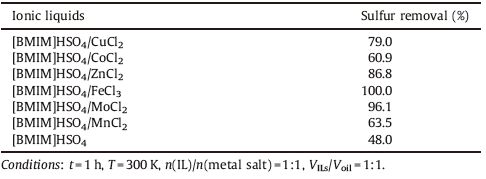 With the number automobiles increasing rapidly in the world, organic sulfur compounds present in diesel fuel oils lead to more emission of SOX by combustion, which not only heavily pollutes the atmosphere, but also irreversibly poisons the noble-metal catalysts in automobile exhaust systems [1, 2, 3]. Therefore, the sulfur content specifications in fuels are becoming more and more stringent worldwide. In the petroleum refining industry, catalytic hydrodesulfurization (HDS) is the conventional and commonly used method to reduce sulfur in fuels. However, it is difficult to remove organic sulfur compounds exhibiting steric hindrance at the sulfur atom, such as dibenzothiophene (DBT) and its derivatives, especially 4,6-dimethyldibenzothiophene (4,6-DMDBT) [4]. Severe HDS conditions are required to remove these compounds, such as temperatures about 643 K, pressures in the range of 50-100 bar and a liquid hourly space velocity (LHSV) below 1.5 h-1, which inevitably leads to high capital expenditure [5]. Thus, alternative methods that operate at moderate conditions without requiring H2, such as oxidative desulfurization [6, 7, 8, 9], biodessulfurization [10], extractive desulfurization [11, 12, 13] and adsorptive desulfurization [14] have been investigated. Among these technologies, extractive desulfurization has been studied extensively because of its facile and simple operation. A number of organic solvents, such as polyalkyleneglycol and polyalkyleneglycol ether, were tested as extractants for the removal of sulfurcontaining compounds from fuel oils, but their performances were never satisfactory. Recently, ionic liquids (ILs) have been employed in the extractive desulfurization of fuel oils because of their unique properties, such as the immiscibility with fuel oils, high affinity to sulfur-containing compounds, nonvolatility, and high thermal stability [15, 16, 17, 18], However, the efficiencies of various kinds of ionic liquids used as extractants on sulfur removal were rather low [19, 20]. Based on published papers [21, 22], metal-based ionic liquids drew our attention and interest due to their obvious advantages. Zhang et al. [23] found AlCl3-based ionic liquids were effective for the removal of S-containing compounds, however, the application of AlCl3-based ionic liquids was limited to the absorption of certain aromatic compounds, such as DBT. Huang et al. [24], found that a CuCl-based ionic liquid exhibited remarkable desulfurization ability in the desulfurization of gasoline; however, the extraction was carried out at relative high temperature 80 ℃. Nan Hee Ko et al. [25] found FeIII-containing ionic liquids were effective extractants for the desulfurization of a model (simulated) oil consisting of dibenzothiophene (DBT) dissolved in n-octane at room temperature.