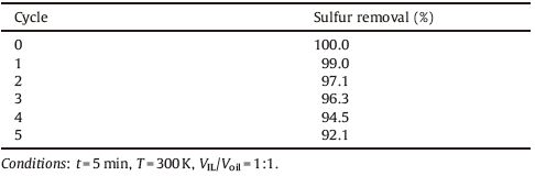 At the end of each run, the IL phase (lower-layer) was withdrawn and DBT in the [BMIM]HSO4/FeCl3 IL was re-extracted from the IL by an equal volume of carbon tetrachloride based on the similarity-intermiscibility theory. Then, [BMIM]HSO4/FeCl3 IL was reused for six times with fresh model oil. The results are shown in Table 4 indicating the desulfurization ratio decreased from 100% to 92.1%, which may be due to losses of regenerated ionic liquid.