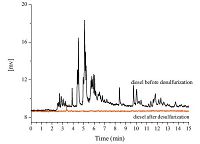 | Fig. 4.GC-FPD chromatogram of actual oil before and after extraction. Conditions: t = 5 min, T = 300 K, VIL/Voil = 1:1. | |