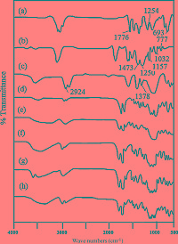 | Fig. 2.FTIR spectra of (a) pure PVC, (b) pure PEMA, (c) LiClO4, (d) PVC(5)–PEMA(20)– LiClO4(8)–PC(67)–TiO2(0), (e) PVC(5)–PEMA(20)–LiClO4(8)–PC(67)–TiO2(5), (f) PVC(5)–PEMA(20)–LiClO4(8)–PC(67)–TiO2(10), (g) PVC(5)–PEMA(20)–LiClO4(8)– PC(67)–TiO2(15), and (h) PVC(5)–PEMA(20)–LiClO4(8)–PC(67)–TiO2(20). | |