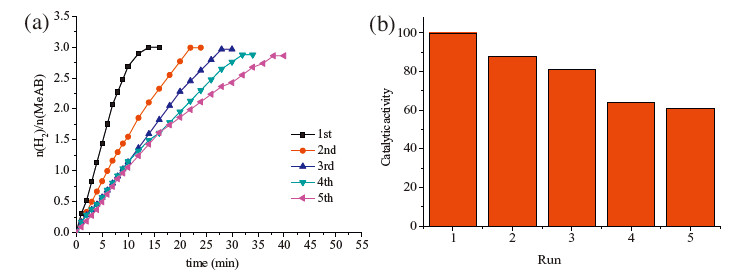 | Fig. 9.(a) Cycle stability test for the hydrogen generation from aqueous MeAB in the presence of Ru/MCM-41 catalyst (Ru/MeAB molar ratio = 0.0055). (b) Percentage of initial catalytic activity of Ru/MCM-41 in successive runs after the reuse for the hydrolysis of MeAB. | |