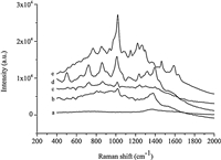 | Fig. 5.SERS spectra of CBZ in tea spiked different concentration of CBZ (mg kg-1). (a) 0, (b) 0.5, (c) 1.0, (d) 5.0, (e) 8.0. | |