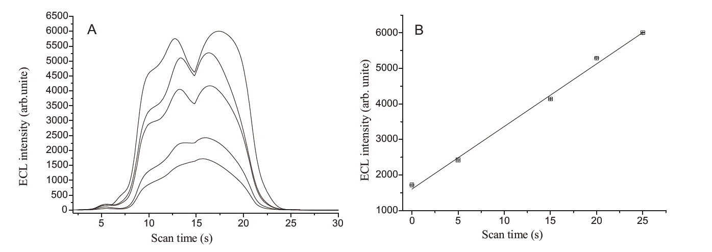 2.4. ECL measurements[Ru(bpy)2(luminol-bpy)](PF6)2 (10 μmol/L) and HRP (1.0 μmol/L) was stirred with different concentrations of H2O2 (0 μmol/L,5 μmol/L,15 μmol/L,20 μmol/L,25 μmol/L) at room temperature for 30 min in the PBS buffer (25 mmol/L,pH 12.0), respectively. The glassy carbon (3.0 mm in diameter) electrode and KCl saturated Ag/AgCl electrode were used working electrode and reference electrode,respectively,and a platinum wire (0.3 mm in diameter) was used as the auxiliary electrode. Before measurements,the glassy carbon working electrode was soaked in 10% HNO3 in an ultrasonic water bath for 1 min,then polished by an Al2O3 slurry,and thoroughly rinsed with deionized water for 1 min. The voltage of the photomultiplier tube was set at 900 V in the detection process while collecting the ECL signals.