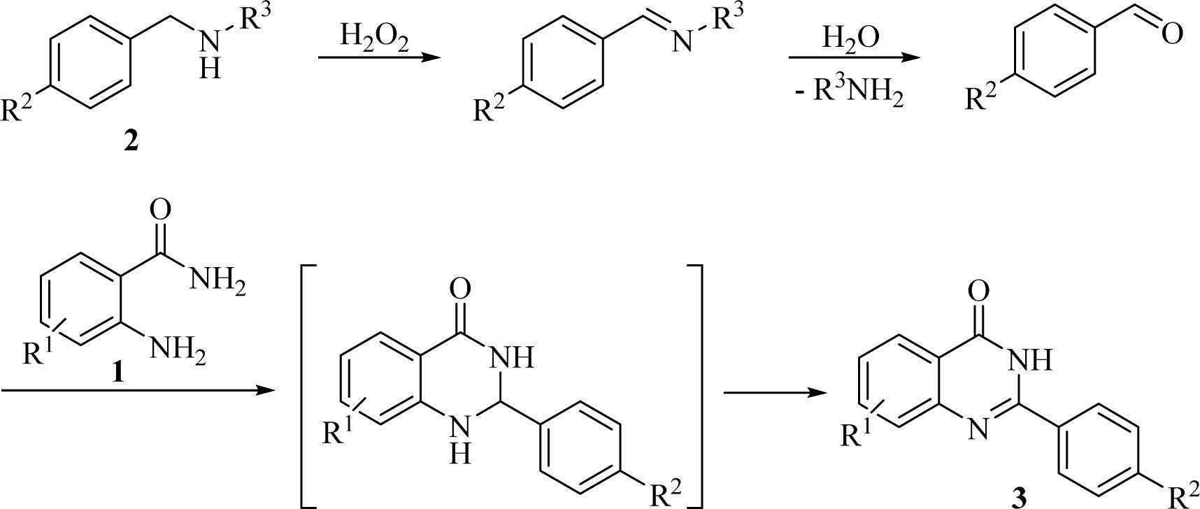 Regarding the reaction pathway,a possible reaction mechanism has been proposed in Scheme 1. First,benzyl amine 1 was oxidized to benzaldehyde in the presence of H2O2. Then,the condensation of the in situ formed aldehyde with o-aminobenzamide 2 occurred. The condensed intermediate can provide the final quinazolinone 3 after further oxidation step.