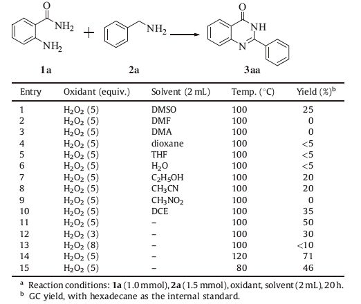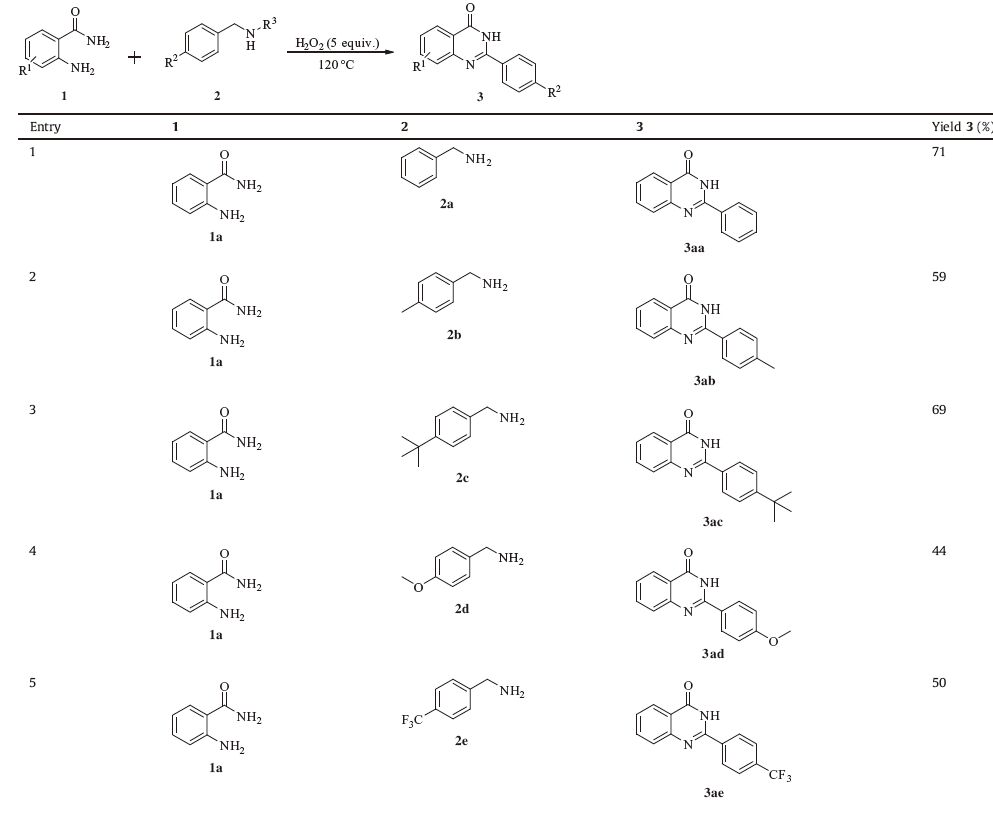 2. ExperimentalA 15 mL tube was added 2-aminobenzamide (1 mmol),benzyl amine (1.5 mmol),and a stir bar. Then H2O2 (30 wt% in H2O,5 equiv.) was added by a syringe at room temperature under open air. The tube was closed and kept at 120 ℃ for 20 h. The conversion and yield were determined by GC and GC-MS using hexadecane (0.1 mmol) as the internal standard.