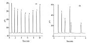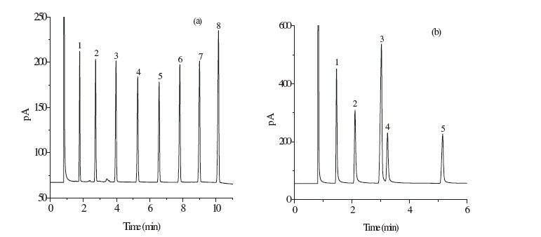 | Fig. 1.Separations of n-alkanes (a) and halogenated benzenes (b) on PDA-CB7 column. Peaks for (a): (1) nonane,(2) decane,(3) undecane,(4) dodecane,. (5) tridecane,(6) tetradecane,(7) pentadecane,(8) hexadecane; for (b): (1) chlorobenzene,(2) bromobenzene,(3) 1,4-dichlorobenzene,(4) 1,2-dichlorobenzene,(5)1,2,4-trichlorobenzene. Temperature programs: (a) 40 ℃ (1 min) to 130 ℃ at 10 ℃/min and (b) 40 ℃ (1 min) to 90 ℃ at 10 ℃/min. | |