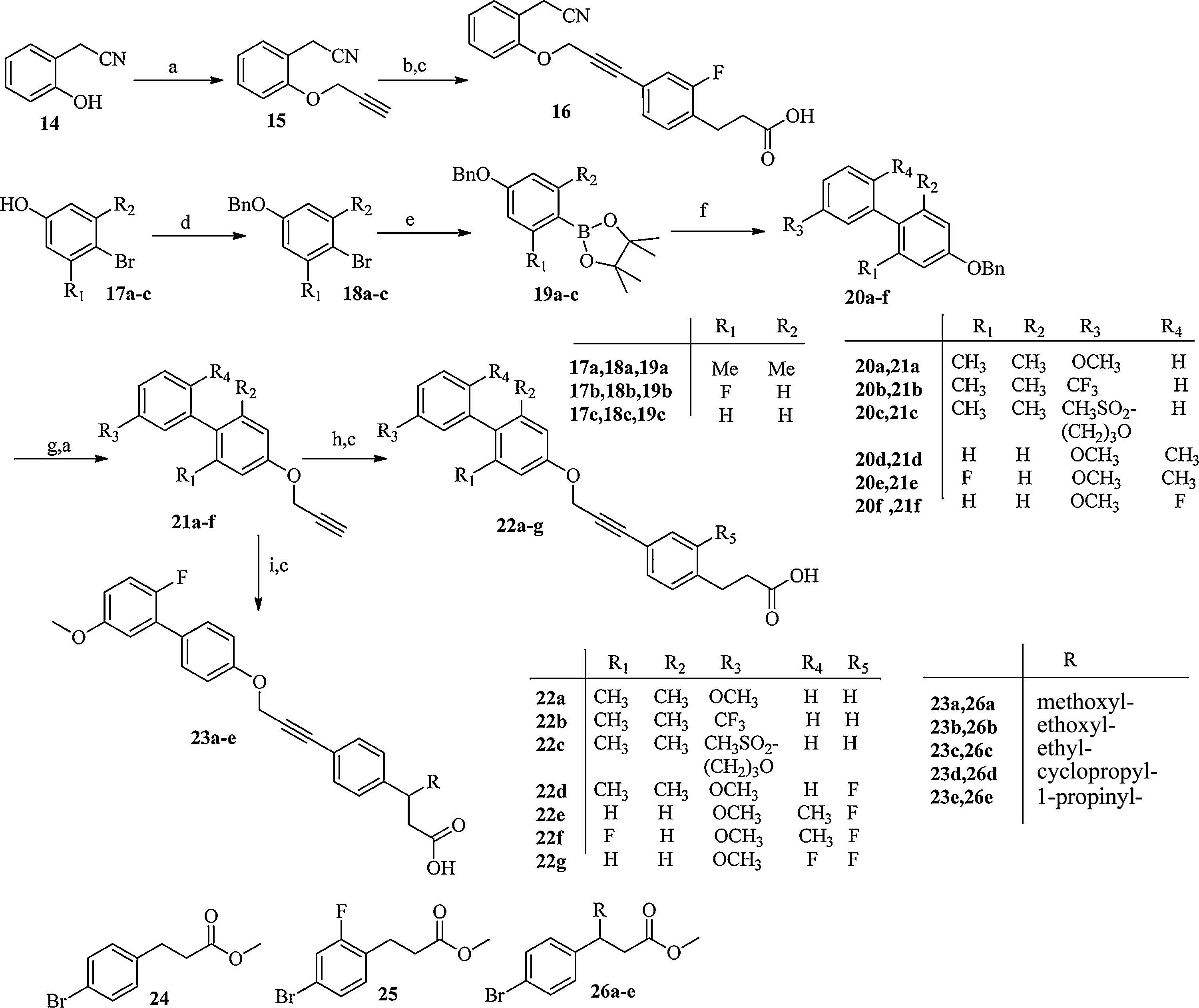In order to reduce the potential for β-oxidation of the propionic acid head,a series of small residues were introduced into the bposition [10]. As shown in Table 2 (compound 23a-e),the activity on the GPR40 varied significantly with different groups at the bposition. The activity almost disappeared when the methoxy, ethyl,or cyclopropyl groups were introduced (compound 23a,23c and 23d),while the introduction of an ethoxy or alkyne groups were tolerant. The most potent alkyne derivative 23e displayed comparable agonistic activity with compound 22g.