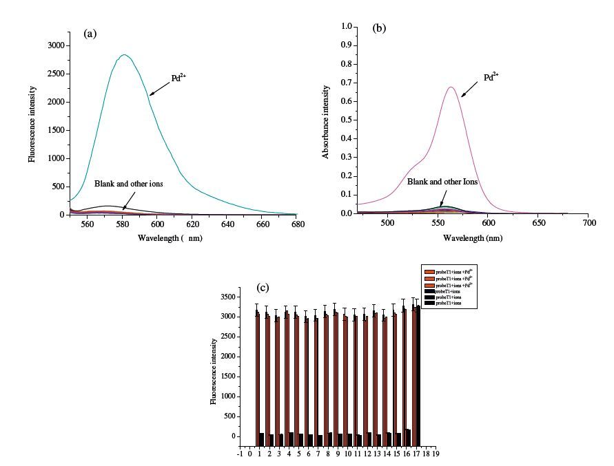 It is an essential feature for a probe to have a high selectivity toward the analyte over the potentially competing species. Shift of fluorescence and absorbance spectra caused competition and selectivity by T1 in the presence of Pd2+ and other competitive metal ions were recorded in Fig. 1a and b,respectively. No obvious fluorescence changes were observed in the presence of other cations (Fig. 1c),such as heavy and transition metal ions (Mn2+,Pb2+,Cd2+,Co2+,Fe3+,Cu2+,Ni2+,Ag+ ,Zn2+,Cr3+,Hg2+),alkali or alkaline-earth metals (Na+,Ca2+,Mg2+,Ba2+) and Al3+.