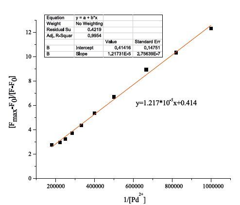 | Fig. 4.Determination of binding constant of T1 (10 μmol/L) with Pd2+ (10 μmol/L) using Benesi–Hildebrand equation. | |