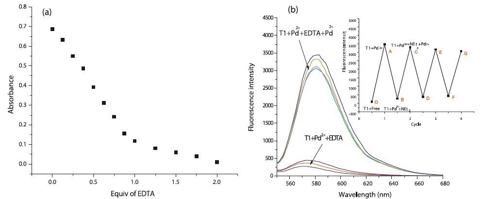 | Fig. 6.(a) Absorbance changes of T1 (10 μmol/L) upon the addition of each equiv of EDTA with the presence of Pd2+ in methanol–water (4/6, v/v) solution. (b) Fluorescence intensity of probe T1 + Pd2+as a function of EDTA concentration in methanol–water (4/6, v/v) solution. Inset: Fluorescence intensity at 583 nmfor three cycles of the switching process. | |