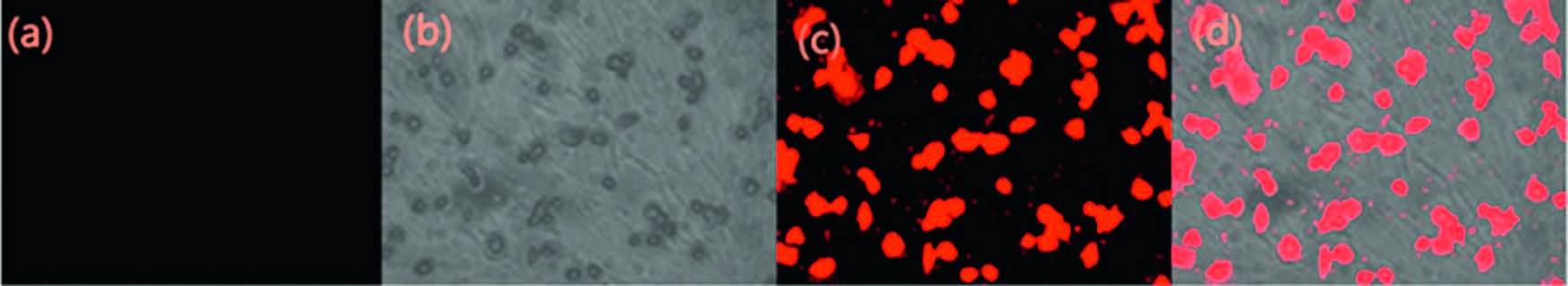| Fig. 8.Probe T1 for Pd2+ fluorescence images in HepG2 living cells. Fluorescence images of HepG2 cells treated with probes (20 μmol/L) in either the absence (a) or the presence (c) of 20 μmol/L Pd2+ for 1 h at 37 ℃. (b) Bright-field image of cells shown in panel. (d) Overlay image of (b) and (c). | |