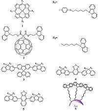 Layer by layer (LbL) assembly could be the most versatile technique among many thin film preparation methods, which can assemble the materials into nanometric thin films at a variety of substances through mostly noncovalent interactions between pair of layers. For example, the polyelectrolyte multilayers can be fabricated through alternating deposition of polyanions and polycations [14]. Electrochemically fabricated thin films usually are conductive, stable and unsolved in normal solvent, making them possible for further fabrication of next layer of other materials. As a novel electrochemical driving force for LbL assembly, the different building blocks with pendent carbazoles (porphyrin 1, fullerene 2 and fluorine 3) [15] as shown in Fig. 2 were covalently immobilized into both homo- or hetero- thin films with efficient electronic interactions between pair of layers. In contrast to the conventional methods of thin filmpreparation, themolecularweights, solubilities and film-forming ability are not necessarily obstacles. Use of electrochemical coupling of N-alkylcarbazoles enabled the various materials includingsmallmolecule, polymer, complex andinorganic nanoparticle to be fixed into cross-linked thin films at a substrate surface from solutions of those components. The facile control process by courtesy of electrochemical advantages, the one-pot in situ switching LbL assembly can be achieved by combining oxidative and reductive electrochemical reactions [16]. Inparticular, the bipyridine-Ru complex bearing vinyl groups with reductive electrochemical activity and trifluoren 3 containing pendent carbazole units with oxidative electrochemical activity in one-pot can be electrochemically triggered by alternation of reductive and oxidative potentials. The electroactive sites and functional units of precursors are independent, allowing more flexibility in molecular design and convenient realization of other components assembly This fabrication process without moving or changing experimental gearswould provide powerful strategy for automated LbLmachines The gold nanoparticles 6 can be also integrated into organic/ inorganic hybrid thin film with controlled distribution ability through electrochemical assembly process in alternative solutions This gold nanoparticle layer can be applied as a counter electrode of photovoltaic device because the transparent gold nanoparticle film has a high conductivity value of 1.2 × 102 S cm-1. Significantly, the fully solution-processed photovoltaic device with simple structure of ITO/organic layer/gold nanoparticle electrode can be achieved [17]. This low-cost strategyprovides aneconomic route to fabricated electronic devices with low dependence on work function under vacuum-evaporation free condition. Similarly, multiple assembly of full inorganic nanoparticles was also investigated [18]. This study highlights the integration of multiple nanoparticles into bulky hybrid films or tandem multilayer structures, whichwas difficult to be obtained using traditional LbL technique. The resultant multinanoparticles filmswith desired sequences and thickness are highly stable and photoactive, exemplified by prototype single and doublelayered photodetectors.