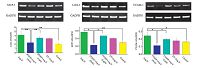 | Fig. 3.RT PCR assay of the expression of mRNA for LOX-1, MCP-1 and VCAM-1 in rat aortic endothelial cells with PTDHP, PT and DHP, respectively, for 1 h at 37 ℃, followed with stimulation with Ang Ⅱ for 8 h in culture medium. Untreated cells set as control. [PT] = 2 × 10-5 mol/L in RUs. [PTDHP] = 2 × 10-5 mol/L in RUs. [Ang Ⅱ] = 1 × 10-7 mol/L. Quantitative analysis of expression of mRNA levels were analyzed by E-gel imager. The error is the standard deviation from the mean (n = 3, * P < 0.05, ** P < 0.01). | |