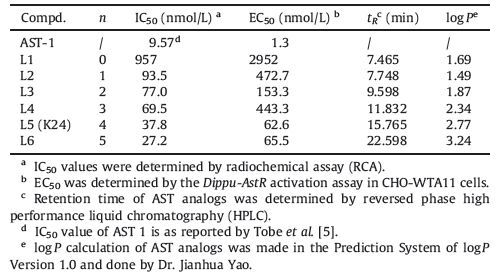 3. Results and discussion 3.1. In vitro effect of AST analogs on the inhibition of JH biosynthesisThe ability of target analogs to inhibit JH biosynthesis was evaluated in vitro using the CA of the cockroach D. punctata. As shown in Table 1, all target analogs exhibit differing potencies as a consequence of varying linker length. L1 (n = 0) shows the lowest activity with an IC50 of 957 nmol/L, compared to other analogs. L2 to L6 are more active in inhibiting JH biosynthesis with IC50 values in the low nanomolar range. L2 (n = 1) with IC50 of 93.5 nmol/L, is about 10-fold activity greater than that of L1. L2, L3 (n = 2) and L4 (n = 3) exhibit slightly improved activity by a small margin when their linker lengths increase from 1-carbon to 3-carbon. L6 (n = 5) with an IC50 of 27.2 nmol/L displays better activity than the lead compound K24/L5 (n = 4, IC50: 37.8 nmol/L). This result suggests that the potency of the analogs may be related to their lipophilicity. Generally, the lipophilicity can be characterized by the retention time or be calculated by the prediction system. Thus, the retention time and log P value of six AST analogs were further determined (Table 1). The result showed that the longer linker length, the longer retention time or the bigger log P value. This demonstrates that longer linkers provide a positive contribution to the inhibitory activity.