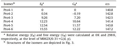 Table 1 Relative energies, free energies (both in kcal/mol) and theoretical ccs (in Å2) of different isomers of Pro4H+. |