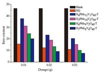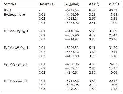 As is shown Fig. 5, the reaction rate constant of blank sample without any inhibitors surpassed that of samples with an inhibitor under all conditions. In other words, the reaction without adding inhibitor was fastest and the reaction rate constants was the highest, which also indicates the existence of MMA selfpolymerization. Both HQ and H3 + xPMo12-xVxO40-T play an important role in the inhibition of MMA polymerization. When the dosage of inhibitors is 0.01 g, it is found that the reaction rate constant of H3+xPMo12-xVxO40-T is higher than that of that of HQ, indicating a lower inhibitory effect of H3 + xPMo12-xVxO40-T than HQ. However, with the increasing of inhibitor dosage, the inhibitory effect based on different inhibitors is enhanced, and H6PMo9V3O40-T is equivalent to that of HQ and H7PMo8V4O40-T surpasses that of HQ when the dosage of inhibitor is 0.02 g. Moreover, when the dosage of inhibitor increased to 0.03 g, the inhibitory effect of both H6PMo9V3O40-T and H7PMo8V4O40-T surpass that of HQ. Meanwhile, the reaction rate constant reduces gradually with the increasing of vanadium atom in H3 + xPMo12-xVxO40-T at any dosages (0.01 g, 0.02 g or 0.03 g).