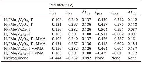 Table 3 The oxidation peak potential, reduction peak potential and redox peak potential difference values of H3 + xPMo12 - xVxO40-T (MMA). |