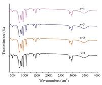 | Fig. 1.IR spectra of as-prepared H3 + xPMo12 - xVxO40-T, x = 1, 2, 3, 4. | |