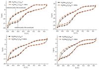 CV characterization of H3 + xPMo12-xVxO40-T on MMA: Cyclic voltammetry (CV) was recorded using a CHI660D electrochemical potentiostat. The measurements were carried out in a threeelectrode cell under nitrogen. The working electrode was a 213 type planar platinum electrode and the auxiliary electrode was a platinum wire. The reference electrode was an Ag/AgCl electrode. A solution of 0.1 mol/L tetrabutylammonium hexafluorophosphate (TBAPF6) in dry DMF was used as an electrolyte. Before the experiment, high purity nitrogen was flowed into the solution for 15 min with a scan rate of 50 mV/s.