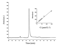 | Fig. 8. HPLC-UV chromatogram of 30 μmol L-1 IMD in 0.05 mol L-1 Na2SO4 solution at pH 7.0. Inset: linear dependence of the area with IMD concentration. Mobile phase: 80% acetonitrile, 20% ultrapure water (vol%), λ = 270 nm. | |