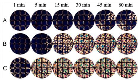 | Figure 2. Optical images of LC confined with copper grids which were decorated with 10 mg/L APG for 10 min after exposure to aqueous solutions with increasing concentrations of gelatin (A) 25, (B) 50, (C) 100 mg/L in different time intervals. All the optical images were taken at room temperature. | |