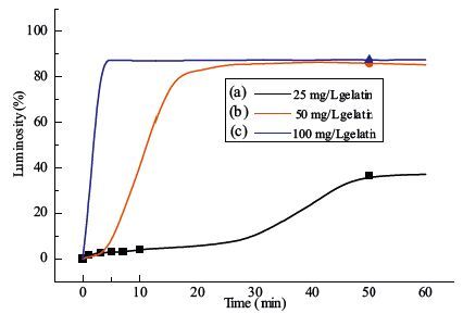 To gain insight into the rearrangement of APG monolayer triggered by gelatin at the LC-aqueous interface, the luminosities of the time-course optical images were analyzed using an image processing software Adobe Photoshop CS6 [33, 35, 36], in which the luminosities of the LC films in 16 square pore of the grid were calculated by Eq. (1) . We quantified the optical observation by plotting the luminance as a function of time after introducing gelatin (or BSA) onto the LC-aqueous interface decorated with APG, obtaining the information regarding the rearrangement of APG monolayer induced by proteins at the LC-aqueous interface. The curves shown in Fig. 3 (for example, curve a) reveal the lag-burst phase, which is a slow phase (termed as lag phase), followed by a rapid phase (termed as burst phase). The lag-phase could reflect the duration of absorption of protein at the LC-aqueous interface decorated with APG. The burst-phase is a measurement of the rearrangement of APG monolayer at the LC-aqueous interface triggered by protein. The slope of the curve of the burst-phase suggests the rearrangement rate of APG at the LC-aqueous interface. As obtained in Fig. 3 that the rearrangement rate of APG monolayer increases with an increasing gelatin concentration. The increase of gelatin concentrations could improve the availability of gelatin at the LC-aqueous interface decorated with APG, shortening the lag-time and enhancing the rearrangement rate of APG. Thus there is no lag-phase observed if the concentration of gelatin is higher than 100 mg/L (Fig. 3, curve c), indicating a time-dependent and concentration-dependent rearrangement of APG at the LC-aqueous interface.