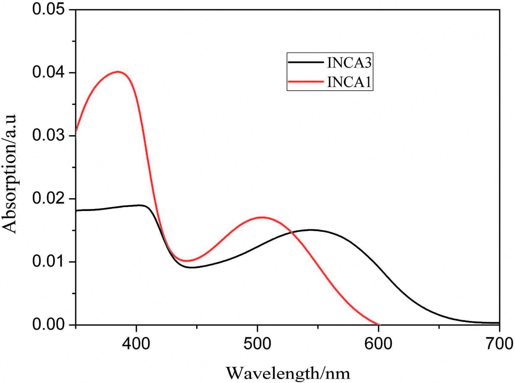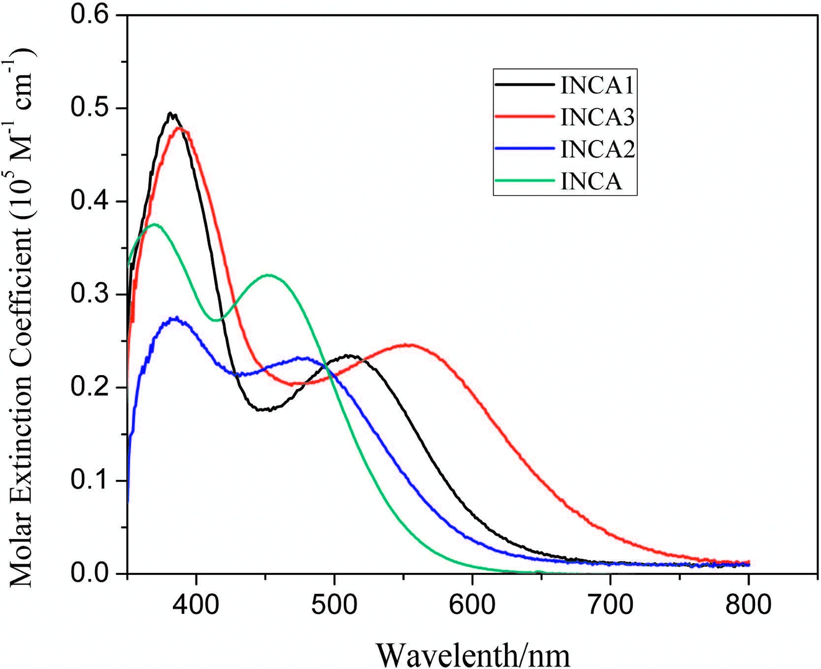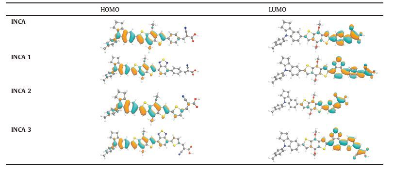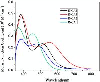 3. Results and discussion 3.1. Optoelectronic propertiesThe UV-vis absorption spectra in the CH2Cl2 solution are shown in Fig. 1 and the data is summarized in Table 1. The maximum absorption band of INCA 1-3 peaks at 454,479,510, and 554 nm,respectively. This band can be ascribed to the intramolecular charge transfer from donor to acceptor under irradiation [8]. INCA 3 shows a red-shift of 40 nm which can be assigned to the reduced delocalization of the electron and the small dihedral angle caused by the thiophene unit. The corresponding molar extinction coefficients are 0.32 × 105,0.23× 105, 0.23 × 105,and 0.24 × 105 L mol-1 cm-1,respectively. The absorption bands located at 372,380,385,and 389 nm can be assigned to the p-p* absorption band. The corresponding molar extinction coefficients are 0.37 × 105,0.49 × 105,0.27 × 105,and 0.47 × 105 L mol-1 cm-1,respectively. Obviously,both the incorporation of the BDT unit and substitution of the benzene with the thiophene can induce the red-shift of the absorption spectra. After the introduction of the BDT unit,the absorption band around 400 nm is intensified and extended toward the near-infrared zone. Theoretical calculations show that the HOMO mainly localizes at the donor and BT units,and the LUMO mainly localizes in the anchoring group. In INCA 1 and INCA 3,LUMO partially extends to the BDT unit,which may facilitate the photo-induced charge transfer from the donor to acceptor,followed by the subsequent electron injection to the conduction band of TiO2 (Tables 2 and 3).