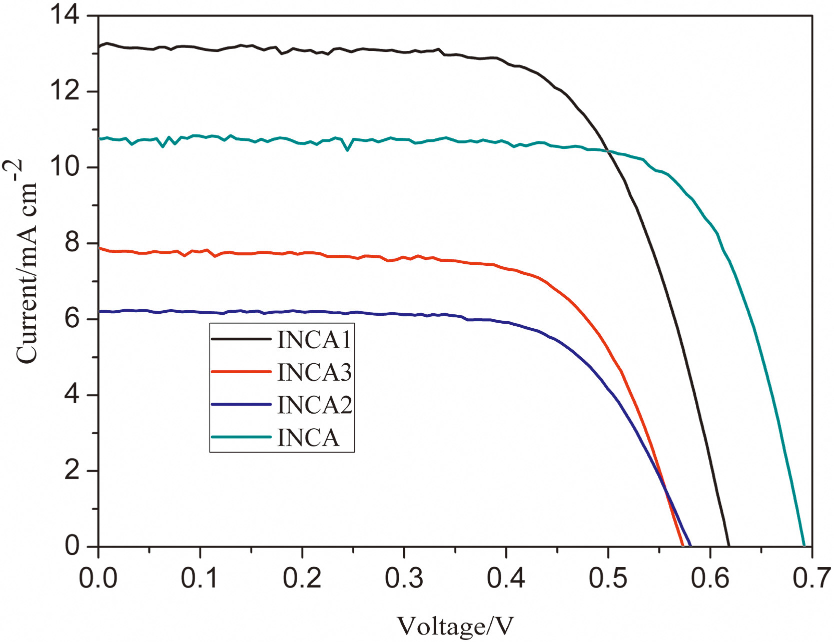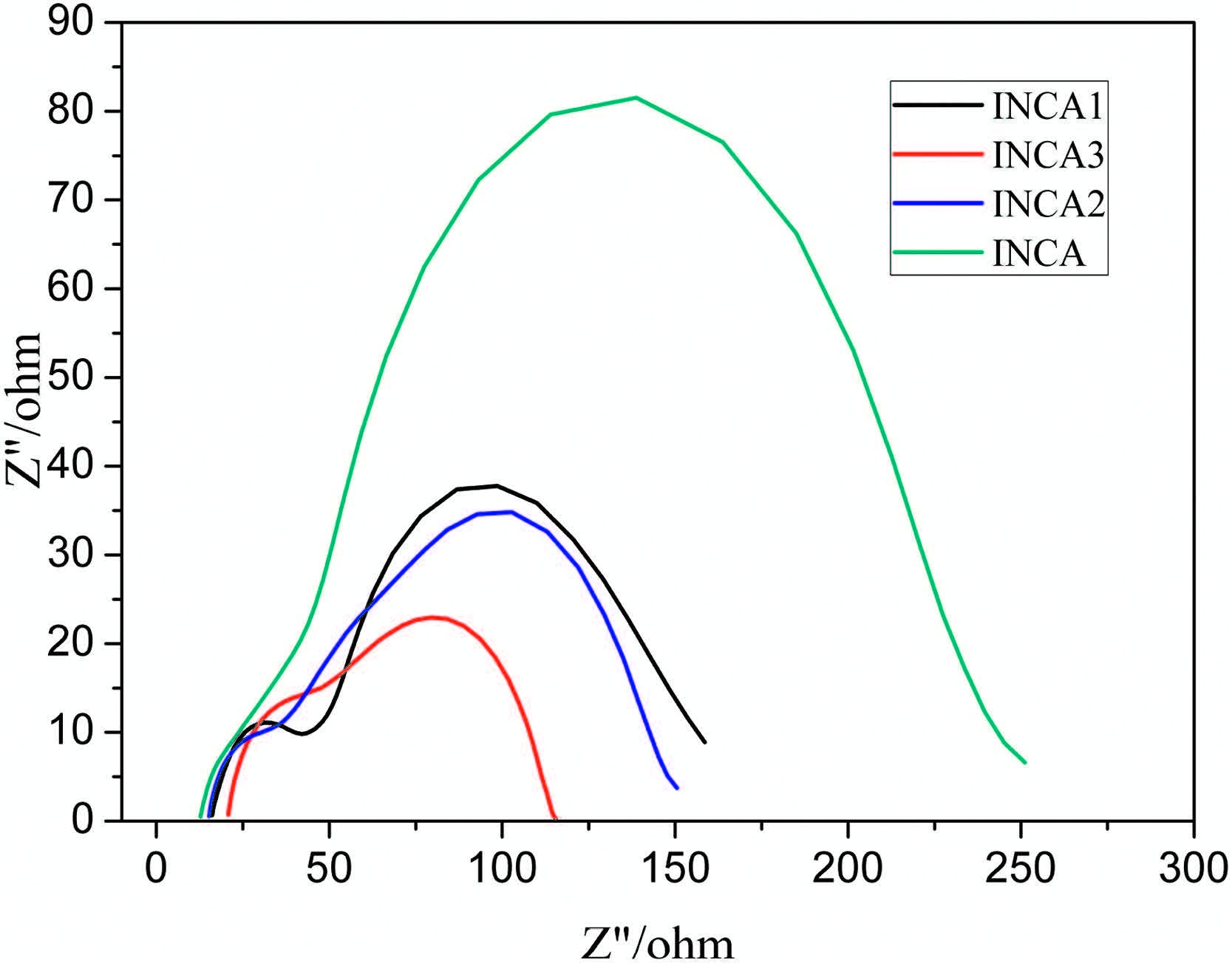 Because the Voc positively correlates with the accumulation of electrons in the conduction band of TiO2,the reduction of electron- hole recombination could improve the Voc [9]. To further explore the relation between the charge transfer process and the relatively high open voltages of INCA and INCA 1 which are ascribed to the relatively low electron-hole recombination caused by the disruption of dye aggregation,we performed electrochemical impedance spectroscopy tests. The larger semicircle at lower frequencies corresponds to the charge transfer processes at the interface between TiO2 and the electrolyte mediator,while the smaller semicircle at higher frequencies reflects the charge transfer processes at the Pt-electrolyte interface. The Nyquist plot is shown in Fig. 4. The radius of the large semicircle decreases in the order of INCA 3 < INCA 2 < INCA 1 < INCA,indicating that electron-hole recombination resistance increases in the order of INCA > INCA 1 > INCA 2 > INCA 3 which is consistent with the variation of the Voc. The large difference in recombination between INCA and INCA 1 accounts for the large difference of voltage (60mv). Slight differences in the recombination resistance between INCA 1-3 explain the slight differences in the voltage.