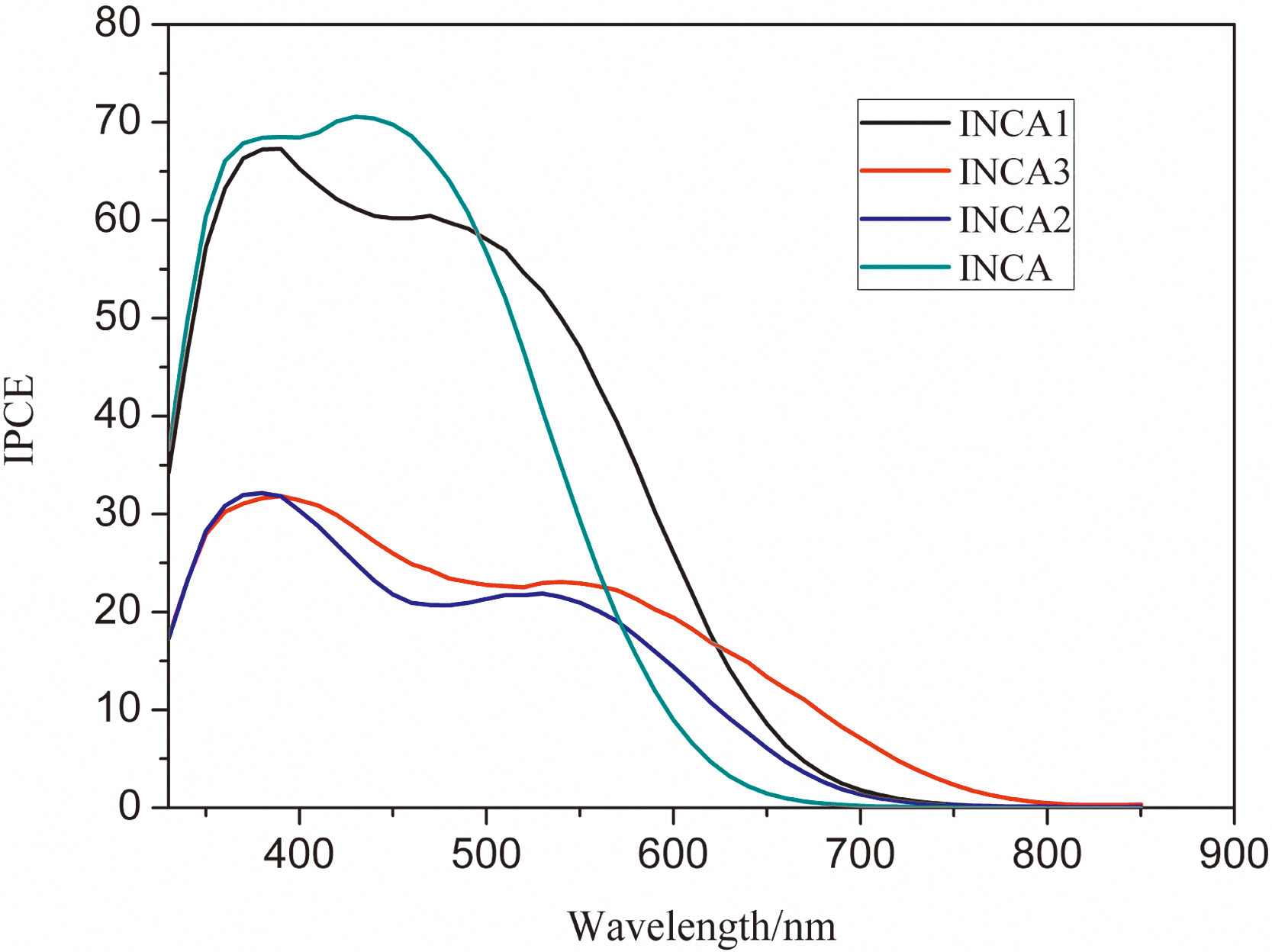 | Figure 3. IPCE curve of device based on four dyes. | |