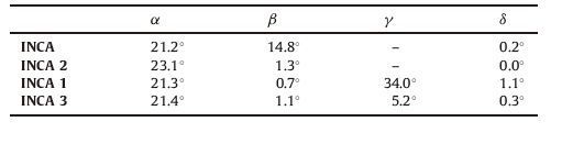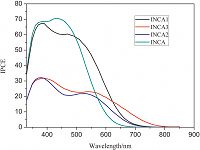 3.2. Photovoltaic propertiesThe photocurrent density-voltage curves of the cells are measured under an irradiance of 100mWcm-2,simulated AM 1.5 sunlight. CDCA (100 × 10-3 mol L-1) was used as a coadsorption additive to prepare the devices which is expected to disrupt the aggregation of the dye when the dye is anchored on the TiO2 film. The dye coated on the TiO2 film is used as the working electrode. The platinized FTO glass is used as the counter electrode and 0.1 mol L-1 lithium iodide,0.6 mol L-1 1,2-dimethyl-3-propylimidazolium iodide (DMPII),0.05 mol L-1 I2,0.5 mol L-1 4- tertbutylpyridine (4-TBP) in acetonitrile is used as the redox electrolyte. Light reflection and absorption by the FTO glass was not taken into account in our calculations. As shown in Fig. 2 and Table 4,the short-circuit photocurrents (Jsc) for INCA and INCA 1-3 are 11.82,13.20,6.22,and 9.93 mA cm-2,respectively. The opencircuit voltages (Voc) for the four dyes are 0.68,0.61,0.58,and 0.57 V,respectively. The fill factors of the four dyes are 66%,67%, 68%,and 68%,and the corresponding efficiencies are 5.35%,5.45%,2.45%,3.87%,respectively. Interestingly,the dye adopting the benzene as a spacer instead of the thiophene displays a better efficiency. After incorporating the BDT unit,INCA 1 and INCA 3 displays better efficiency relative to the parent INCA and INCA 2. Compared with the INCA,the increase in Jsc of INCA 1 contributes to the slight enhancement of efficiency. INCA 2 and INCA 3 show a relatively low Jsc which are not proportionate with their absorption spectra. Thus,we conducted the monochromatic incident photonto- electron conversion efficiency (IPCE) test. INCA shows overall IPCE of 71% over the main absorption band. The IPCEs of INCA 1-3 are 66%,31%,and 31%,respectively. The dyes containing benzene as the bridge unit display better IPCEs than those with the thiophene unit. Considering the good planarity of the molecule,we speculate the low Jsc and low IPCE originates from the recombination caused by aggregation. To verify this hypothesis,we conducted theoretic computation to calculate the dihedral angles of dyes. As shown in Table 5,the four dyes show almost identical a angles. The β angles for INCA 1-3 are also similar. The b angle of INCA is significantly higher than INCA 2,which may account for the above-mentioned improvement of efficiency. The γ angles are 34.0° and 5.2° for INCA 1 and INCA 3,respectively. The trend of dihedral angles is in accordance with the efficiency,indicating that disruption of planarity affects efficiency (Fig. 3).