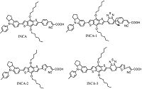 2.4. Structure of four dyes(E)-3-(4-(7-(4,8-Bis(hexyloxy)-6-(4-(p-tolyl)-1,2,3,3a,4,8b-hexahydrocyclopenta[ b]indol-7-yl)benzo[1,2-b:4,5-b0]dithiophen-2-yl) benzo[c][1, 2, 5]thiadiazol-4-yl)phenyl)-2-cyanoacrylic acid (INCA 1): Starting material (450 mg,0.71mmol) was dissolved in 25 mL freshly distilled THF and then cooled down to -78 °C for 10min. Then n-BuLi (0.33 mL,0.77mmol,1.1 equiv.)was added dropwise to the solution. After stirring at 30 min at the same temperature, isopropyl borate (0.18 mL,0.77mmol) was slowly injected into the reaction solution.After stirring for an additional 2 h,the solutionwas warmedto roomtemperature andthemixturewas stirred overnight. The crude mixturewas used without further purification. In a 25mL round-bottom flask was added the crude compound,4-(7-bromobenzo[ c][1, 2, 5]thiadiazol-4-yl)benzaldehyde (225mg,0.71mmol), a catalytic amount of Pd(dffp)Cl2,K2CO3 (138 mg,1mmol),and a solution of THF (15 mL) and H2O (5mL). The mixture was refluxed overnight under nitrogen atmosphere. After the reaction completed, CH2Cl2 (20 mL) was added and the organic layer was separated, then the aqueous solution was washed with CH2Cl2 two times. All of the organic solution was collected. Removing the solvent afforded crude product 3,which was used without further purification. In a 10 mL round-bottom flask was added crude compound 3 (250 mg,034 mmol),cyanoacetic acid (114.68 mg, 1.35 mmol,4 eqiv.),and triethylamine (5 drops). The mixture was refluxed overnight. After the reaction completed,CH2Cl2 (20 mL) was added and the organic layer was separated,then the aqueous solution was washed with CH2Cl2 two times. All of the organic solutionwas collected. After removing the solvent,the residue was purified by chromatography to afford the desired compound (INCA 1),(108 mg) 39.7%. 1H NMR (400 MHz,(DMSO-d6): δ 8.74 (s,1H), 8.57 (s,1H) 8.27 (d,3H,J = 7.7 Hz),8.08 (d,3H,J = 8.5 Hz),7.65 (d, 2H,J = 14.5 Hz),7.44 (d,1H,J = 8.4 Hz),7.22 (t,4H,J = 6.4 Hz),6.86 (d,1H,J = 8.5 Hz),4.92 (s,1H),4.34 (dt,4H,J = 12.1,6.1 Hz),3.87 (s, 1H),2.30 (s,3H),1.93-1.80 (m,7H),1.63-1.52 (m,6H),1.45-1.35 (m,9H),0.92 (s,6H) (Scheme 1).