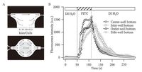 | Figure 1. (A) a longitudinal view and cross-section of the PDMS chamber and channels. The different stimulation solutions were injected into different channels. Only one channel was used each time, and the other channels kept closed. (B) The fluorescence intensity values in different regions of the perfusion microchip were measured during the perfusion of FITC and DI water. The complete exchange of its stimulus solution was clearly explained by the fluorescence intensity variations in the figure. The intensity values at the center-well bottom peaked at approximately 25 s, and 75% of the FITC solution was replaced in approximately 30 s. Therefore, the fluid flowwithin the perfusion microchip was fast enough to switch from one solution to the next solution, which ensured that the islets or cells were able to sense a homogeneous stimulus. It is important to characterize the microfluidic device to reflect an accurate secretory plot. n = 4 for each group. | |