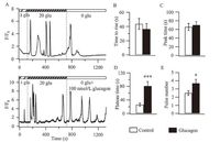 | Figure 2. Glucagon enhances the calcium response in INS-1 cells after switching to a 0 μmol/L glucose solution. (A) Calcium was measured at the single INS-1 cell. The time interval is 500 ms. Each trace is representative of eight recordings from similar experiments. F is the measured fluorescence intensity and F0 is the baseline fluorescence intensity. The average time to rise (B), peak time (C), plateau time (D) and pulse number (E) during the perfusion of a 0 μmol/L glucose solution or a 0 μmol/L glucose solution with 100 nmol/L glucagon. n = 8 for each group. | |