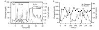 | Figure 3. Glucagon secretion precedes insulin secretion in a 0 μmol/L glucose solution. (A) Insulin and glucagon were both measured from the 80 perfused mice islets. The time interval is 1 min. This trace is representative of five recordings from similar experiments. (B) Enlarged time scale of the first 300 s during insulin and glucagon secretion in solutions from 20 to 0 μmol/L glucose. The time interval is 15 s. This trace is representative of five recordings. Glucagon, solid line, black filled circle. Insulin, dashed line, open circle. | |