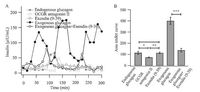 | Figure 4. Endogenous and exogenous glucagon utilize different receptors to promote insulin secretion in mice. (A) The insulin secretion in 20-0 μmol/L glucose was precisely measured for 300 s following the different treatments. This trace is representative off our recordings from similar experiments. Endogenous glucagon, filled circle, dark gray. GcgR antagonist II, open square, light gray. Exendin (9-39), open triangle, dark gray. Exogenous glucagon, filled circle, black. Exogenous glucagon and Exendin (9-39), open circle, black. (B) Area integral of the insulin secretion in response to the various agents. n = 4 for each group. | |