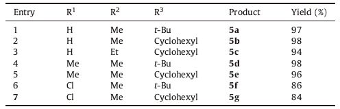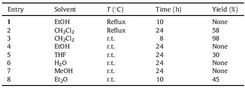 To optimize the conditions, various aprotic and protic solvents were investigated at reflux and r.t. conditions. In protic solvents the desired product was not obtained. However, the desired product was formed in aprotic solvents and was produced under the. Best the conditions in dry CH2Cl2 at r.t. with excellent yield. The results are summarized in Table 1.