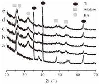 | Figure 5. XRD patterns of TNT and samples after biomimetic mineralization treatment for 2 days: (a) TNT (before mineralization), (b) TNT, (c) TNT/P, (d) TNT/P/D and (e) TNT/P/D/P. | |