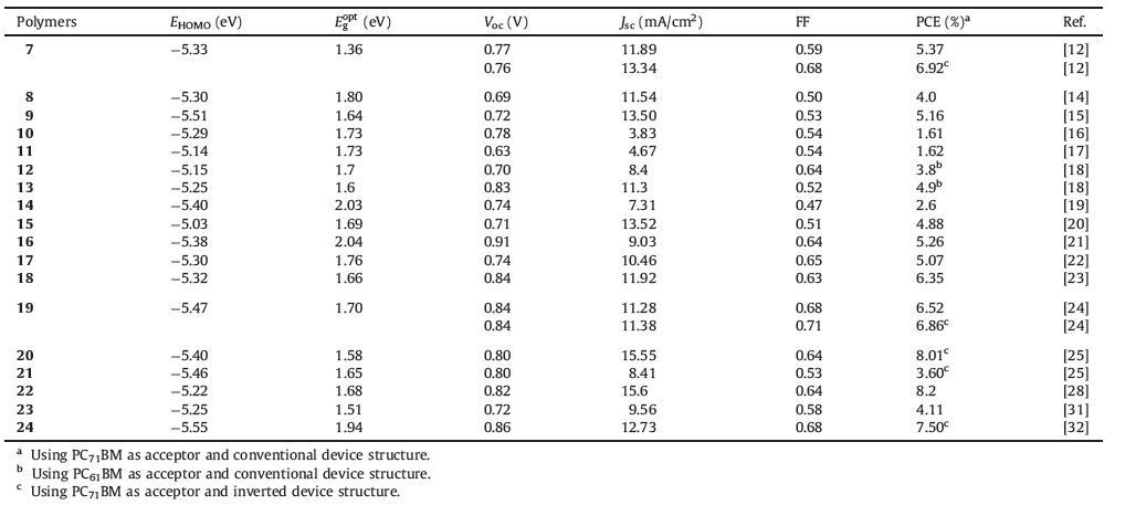 Since 2013, Lee and co-workers have tried to develop a series of D-A copolymers using the same alkoxyl substituted zNDT as donor block and various electron-deficient unit as the acceptor, such as compound 14 [19] and 15 [20] (Fig. 5). But unfortunately, both of them afforded a little poor PCEs (2.6% and 4.88%) (Table 2) less than those of their linear counterparts (4.0% for 8 and 5.16% for 9), probably due to the large optical bandgap resulting in lower Jsc. Li and co-workers also reported several similar D-A copolymers at that time, such as polymer 16 [21] and 17 [22] (Fig. 5). In contrast, they had gained much better results (5.26% for 16 and 5.07% for 17) (Table 2) by changing the type of alkyl side chains and the kind of acceptor unit. Among these zNDT type polymers, the most successful one should be polymer 18 (Fig. 5) reported by Cho and co-workers [23]. The optimized conventional device showed a maximum PCE of 6.35% (Table 2), which should be attributed to much linear conformation of backbone, the faceon orientation of polymer 18, and small-scale phase separation of active layer.