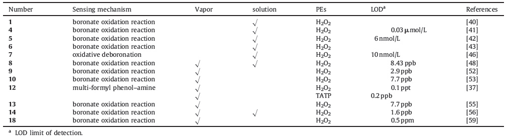 3.2. Organic solution systemsFluorescent signalling-based methods utilizing fluorescence turn-on in solution after interaction with H2O2 or TATP have been developed to image living cells as well as to detect peroxide recently [44, 45]. A few recent papers reported on fluorescence sensors that can be employed for detection of PEs in aqueous solution.